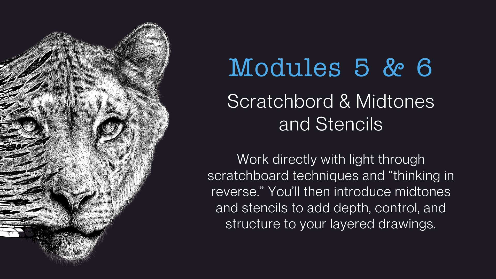 A 7-hour course with 30+ videos exploring layered drawing through ink, scratchboard, and light. Guiding you through a quiet, intentional process of building depth, texture, and personal expression.